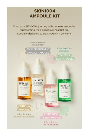 Το Skin1004 Madagascar Centella Ampoule Kit Gift Box είναι ένα σετ περιποίησης προσώπου που περιέχει τέσσερις μίνι αμπούλες (serums) των 30ml η καθεμία, καθεμία σχεδιασμένη για να αντιμετωπίζει διαφορετικές ανάγκες της επιδερμίδας χρησιμοποιώντας εκχύλισμα Centella Asiatica από τη Μαδαγασκάρη.