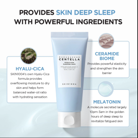 Η Skin1004 Madagascar Centella Hyalu-Cica Sleeping Pack είναι μια ελαφριά, ενυδατική μάσκα ύπνου σε μορφή gel που έχει σχεδιαστεί για να καταπραΰνει και να αναζωογονεί την επιδερμίδα κατά τη διάρκεια της νύχτας